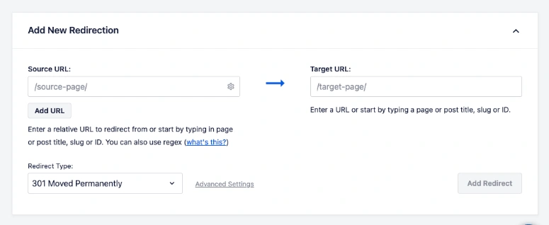 AIOSEO的重定向管理器使之非常容易做到这一点。你只需要输入源URL和目标URL。其他一切都会被处理好。你永远不必担心编码和技术问题。