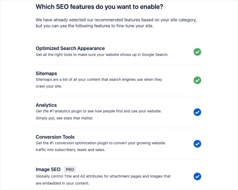 之后,该插件会给你一个你可以在你的网站上启用的功能列表。默认情况下,选择推荐的设置。但请确保你阅读这里的描述,因为有些功能会在你的网站上安装一个单独的插件。