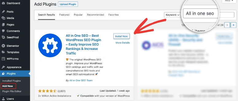 在这里,搜索All in One SEO并安装和激活该插件。
