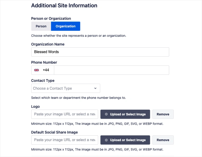 在下一步,AIOSEO将要求您提供额外的信息,如您的组织类型、联系人、标志和社会营销。