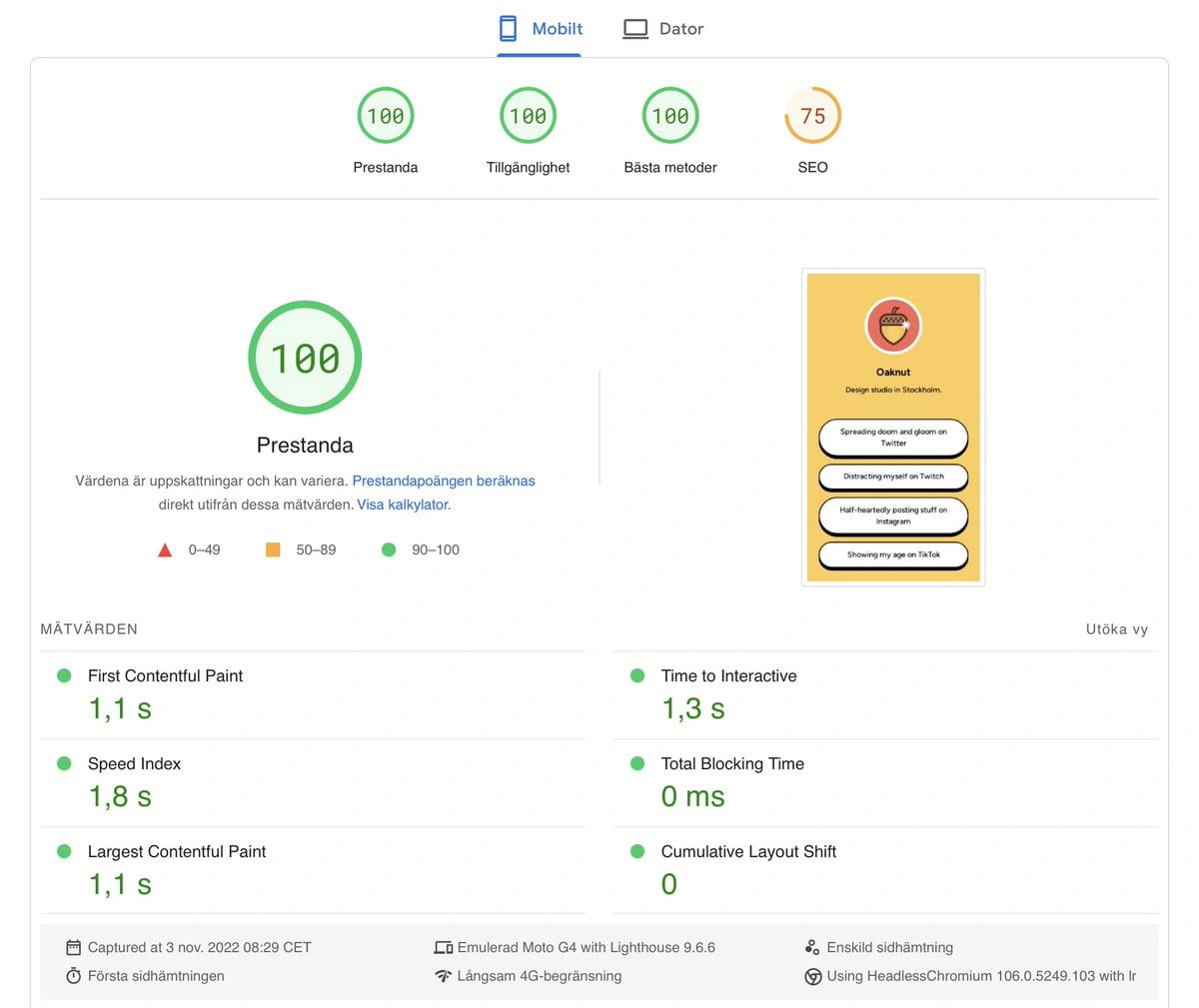 Norén 分享了一个使用 Lighthouse 性能得分为 100 的主题的网站截图。