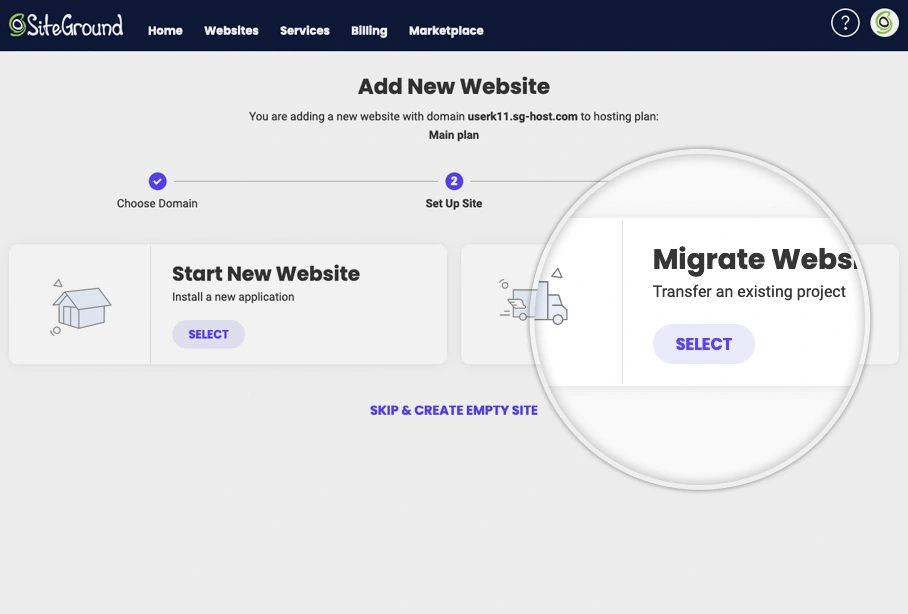 当你选择好域名后,您可以在网站设置向导的第二步中轻松地将现有网站迁移到SiteGround。要启动网站转移,请点击**Migrate Website**下的**Select** 。  然后,您可以选择是通过Si...