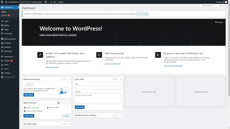 这是您首次登录网站时WordPress管理面板的外观。您可能会注意到 WooCommerce已经被安装,如果您在设置服务器时选择Cloudways WooCommerce 安装选项。