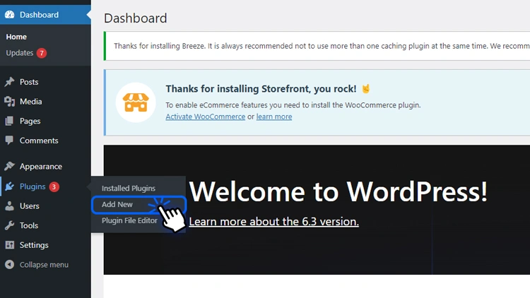 如果您仍然需要安装 WooCommerce,只需几个简单的步骤即可完成。转到Plugins > Add New。