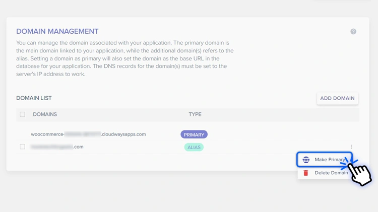 选择域旁边的三个点图标,然后选择Make Primary。通过在确认弹出窗口中选择**“Set As Primary**”来确认操作。