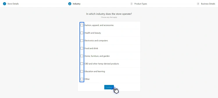 接下来,从可用选项中选择您的行业。如果找不到匹配的行业,请选择“其他”,然后选择**“继续”**。