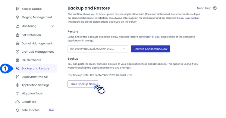 在应用程序管理页面上,转到**“Backup and Restore**”,然后选择**“Take Backup Now**”。