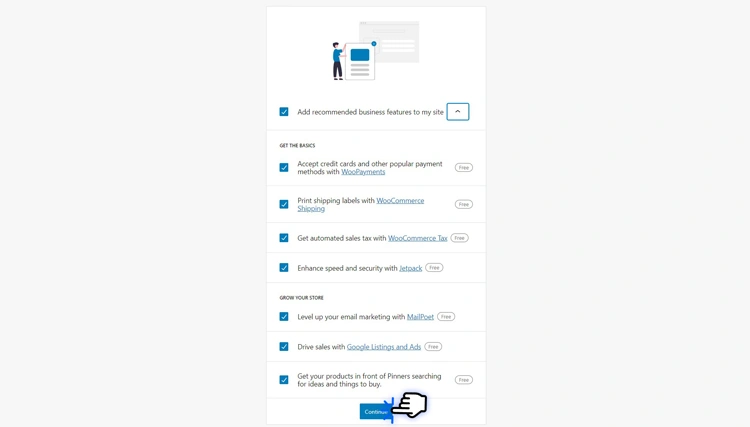 默认情况下,WooCommerce 会选中所有框。取消选中您不想在商店中使用的任何复选框,或取消选中将Add recommended business features to my site 复选框来取消选中所有复选框。然后,选择Continue。