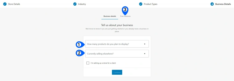 选择您计划销售的产品数量以及您是否在其他地方销售。然后,选择“Free features”选项卡,单击向下箭头以展开免费功能选择列表,然后选择要在商店中安装的免费功能。