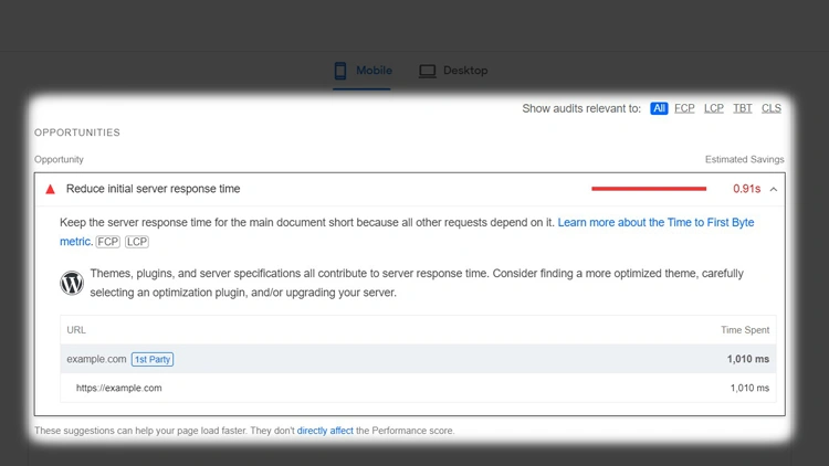 向下滚动到**“Opportunities**”部分,然后单击向下箭头以展开每个建议的说明,以了解如何提高网站性能。