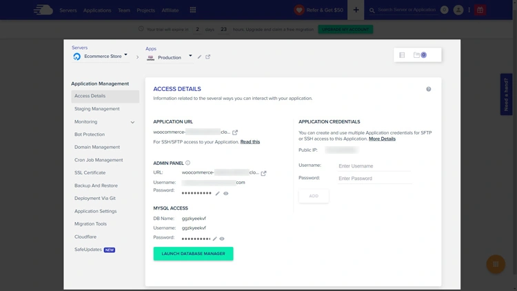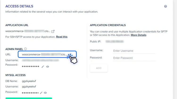 - 访问详细信息:访问详细信息,例如应用程序 URL、管理面板凭据、应用程序凭据和 MySQL 访问信息。