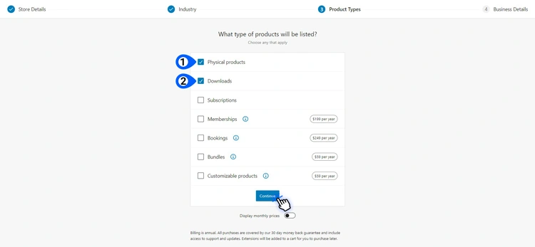现在,您需要选择要销售的产品类型。选择实体产品和下载。随意忽略其他选项。您的选择不会更改商店中支持的 WooCommerce 产品类型。