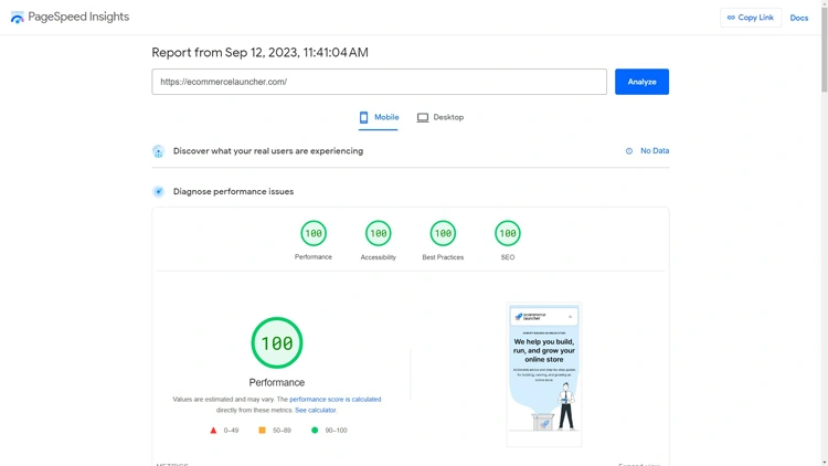 打开 PageSpeed Insights,将您的网站 URL 粘贴到 URL 字段中,然后单击Analyze。