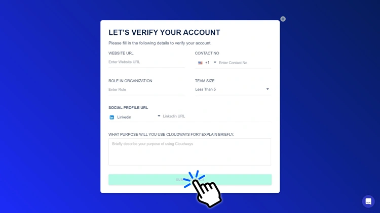 Cloudways 要求您提供基本信息,例如您的网站 URL、联系电话、组织规模、您的角色、指向您的社交媒体资料之一的链接,以及您将使用 Cloudways 的简短描述。
