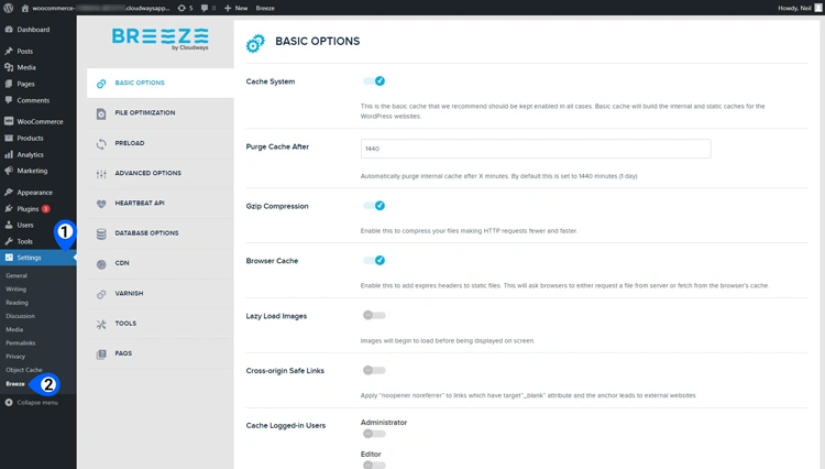 Cloudways 在您的网站上预安装了一个名为 Breeze 的缓存插件。您可以从WordPress 管理面板 Settings > **Breeze**访问它。