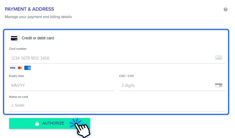 在下一页上,输入您的银行卡详细信息,然后选择“Authorize”以授权对您的银行卡进行少量收费。