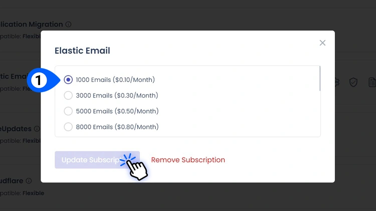 向下滚动并点击 Elastic Email。根据您预计每月发送的电子邮件数量(例如,1000 封电子邮件(0.10 美元/月))选择计划,然后单击“Subscribe”。