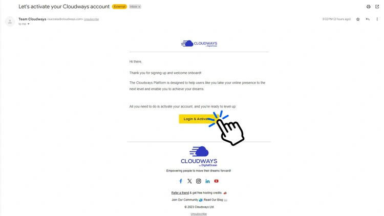 登录您的电子邮件帐户,打开 Cloudways 的激活电子邮件,然后选择Activate Account。