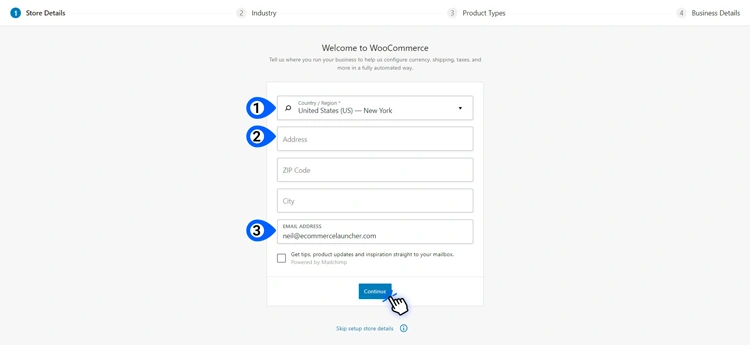 首先,输入您的商店详细信息,以便 WooCommerce 可以帮助您自动配置货币、运费和税费。添加您的商店地址和其他详细信息,然后选择Continue。