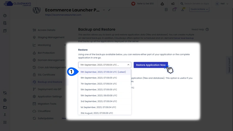 就是这样。Cloudways 将根据您选择的设置自动创建并保存备份。您可以随时返回同一位置以恢复备份。