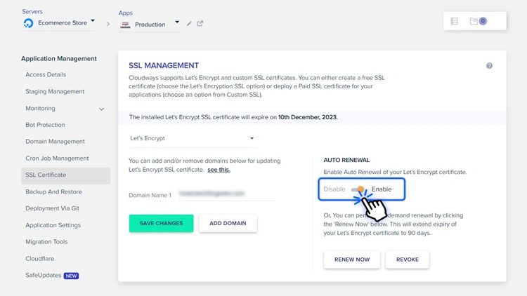 Cloudways 在您首次设置服务器时甚至在更新域名后都会自动为您的网站安装 SSL 证书。