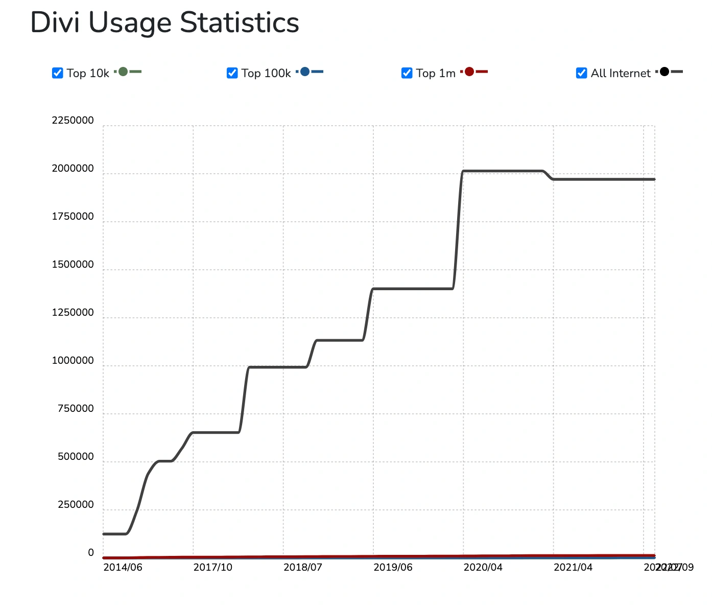 据 BuiltWith 称,目前有超过2,425,411 个实时网站 正在使用 Divi,另有 1,486,812 个网站曾使用过该产品。这款推出近 10 年的产品多年来一直稳步增长,但似乎从 2020 年开始趋于平稳。