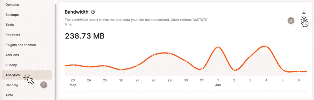为支持这一转变,MyKinsta 分析功能也变得更加灵活。客户现在可以将分析数据导出为 CSV 文件,以便更轻松地在仪表板之外查看带宽、访问次数、缓存和性能数据。