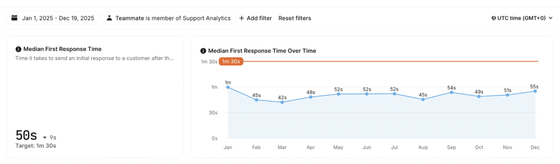 响应时间也有全面改善。首次响应时间中位数为50秒,远低于我们内部设定的1分30秒的目标。