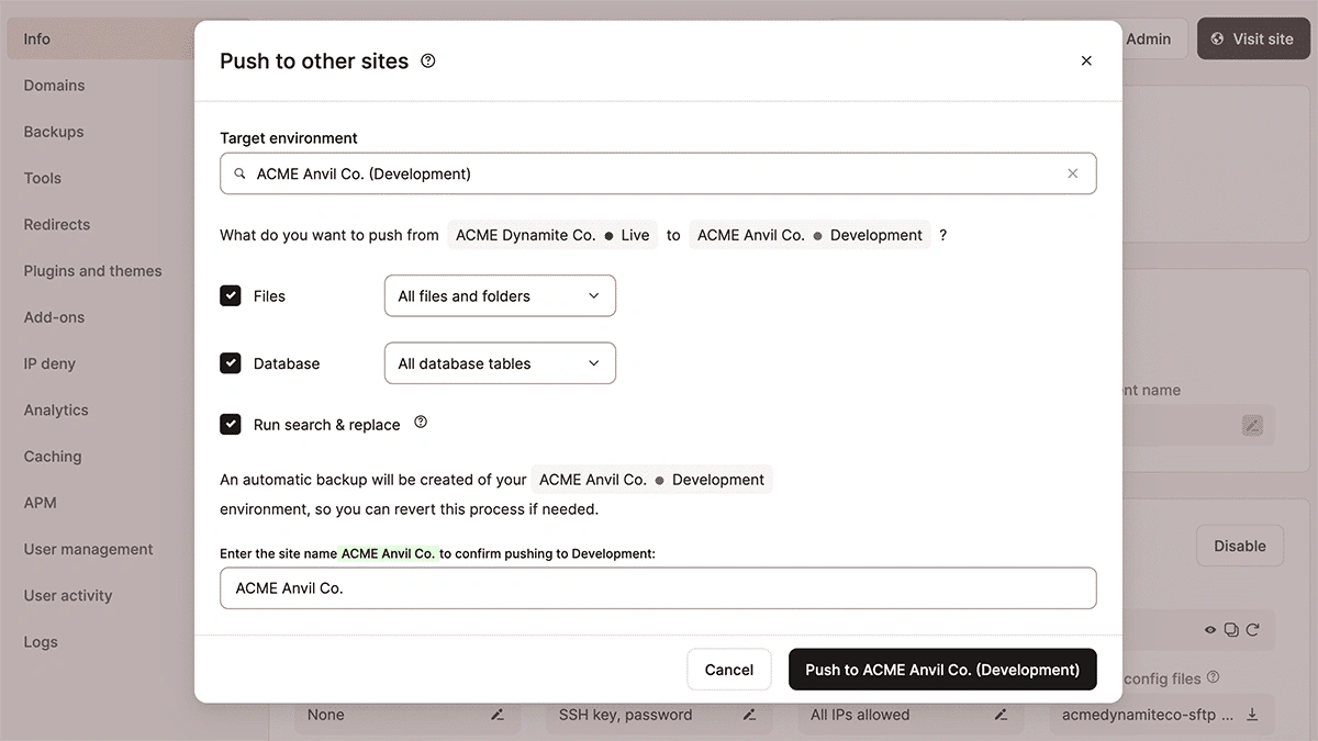 对于管理多个站点的团队来说,跨站点部署使得在不同的WordPress安装之间推送环境成为可能,支持更高级的工作流程,无需依赖手动迁移或外部工具。
