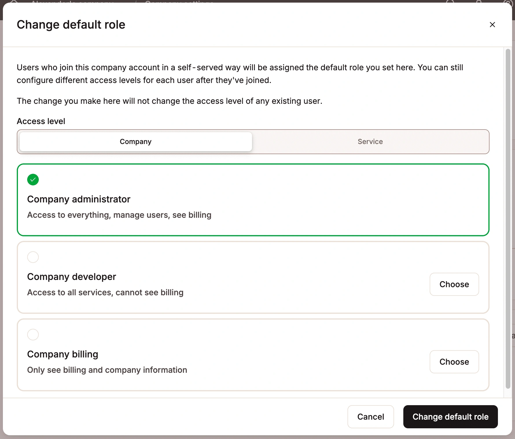 默认情况下,通过 JIT 配置访问 MyKinsta 的团队成员会被分配公司开发者角色。公司所有者和管理员可以在用户加入后更改其角色,也可以在用户加入之前修改新 JIT 配置用户的默认角色。