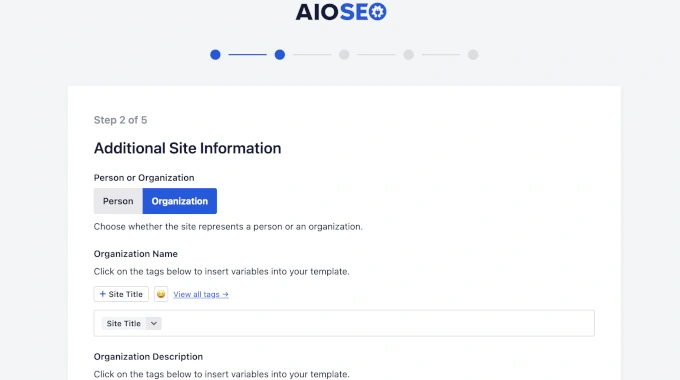我真的很喜欢"个人或组织"这一步。这是你添加 Logo 和社交个人资料 URL 的地方。Google 使用这些数据来构建其知识图谱,AIOSEO 让填写这些信息变得很简单。