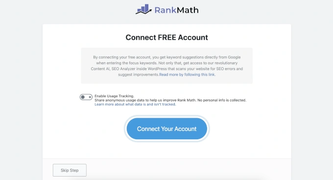 Rank Math 也有设置向导,但感觉有点不同。当我激活它时,首先看到的是连接 Rank Math 账户的提示。