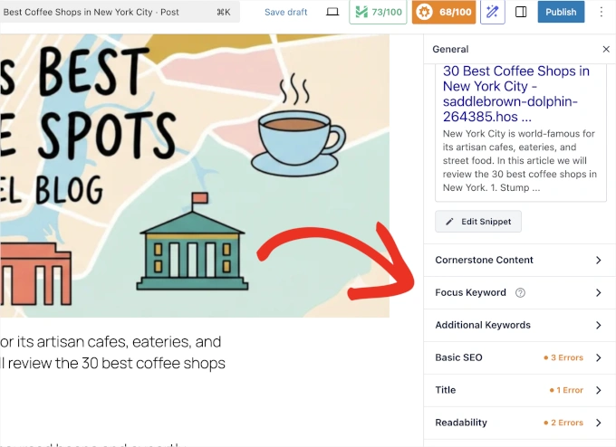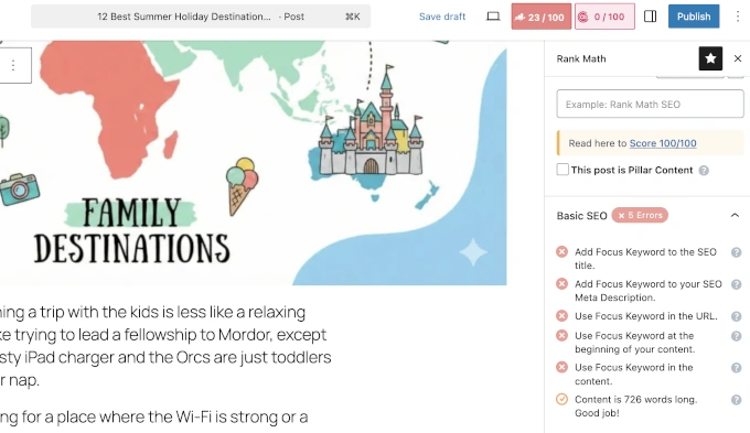 不过,我注意到Rank Math的编辑器可能有点“繁忙”。同时会有很多数字和建议扑面而来。如果你是一个极简主义者,可能会觉得AIOSEO的界面更简洁、更容易导航。