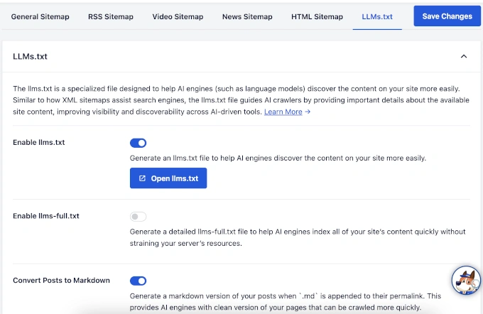 但是,它目前缺少带有 Markdown 转换功能的 advanced llms-full.txt。它能为机器人指向你的页面,但无法像 AIOSEO 那样将内容翻译成“机器人友好”的语言。