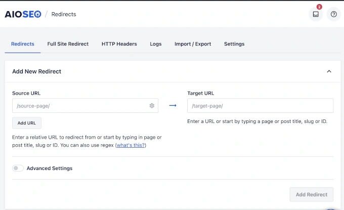 虽然 Rank Math 包含重定向管理器,但它主要依赖 PHP 方式的的重定向。这种方法在技术上比 AIOSEO 的服务器级方法慢,因为服务器必须在重定向执行之前加载 WordPress 核心。