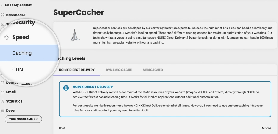 SiteGround比较注重对待网站性能的优化。这就是为什么我们开发了SuperCacher - 强大的缓存解决方案,可以多次加快网站速度。它适用于Siteground所有套餐,包括三个缓存选项,可以通过你的Site Tools > Speed > Caching来进行管理