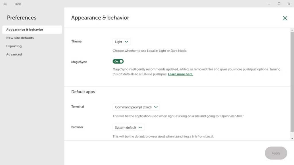 你可以通过顶部的主菜单进入本地设置,然后选择首选项。它有很多设置可以根据你的需要进行定制,比如在浅色和深色主题之间切换,为你想使用的命令行、浏览器和新网站配置设置默认值。