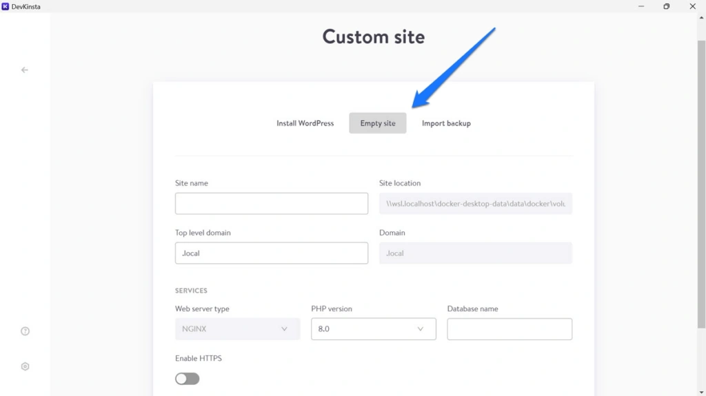 DevKinsta 的一个实用功能是可以用于非 WordPress 网站。为此,只需创建一个自定义网站,然后在设置中选择 "空网站 "即可。