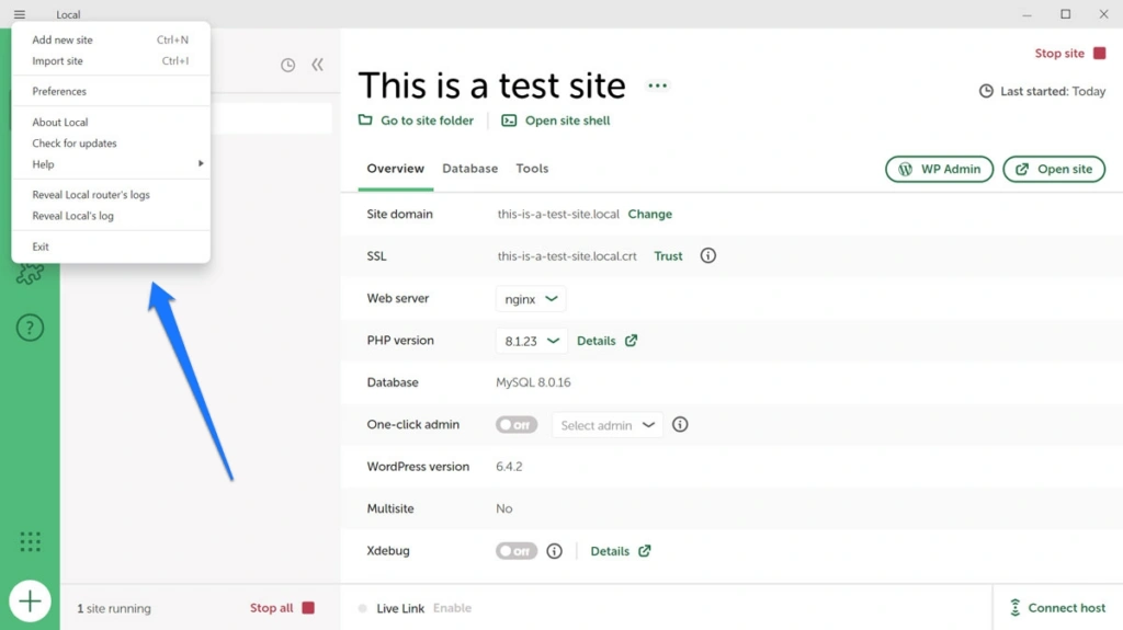 当网站处于活动状态时,在屏幕顶部,Local允许您一键转到网站所在的文件夹或打开 shell 命令。您还可以通过两个按钮一键访问 WordPress 后台和网站本身。