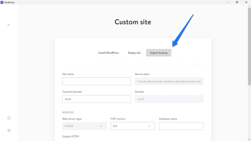 手动导入网站的操作与此类似。创建新网站时,选择自定义网站,然后切换到导入备份选项卡。