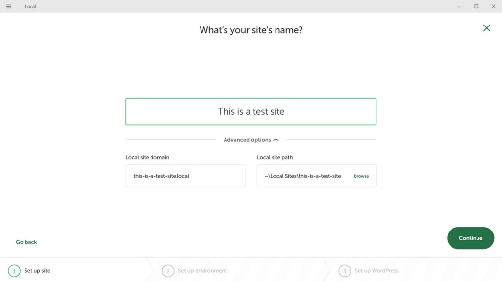 本地程序会要求你提供一些信息,比如你想使用的环境、网站名称、路径和域名。不过,它还会在导入过程中添加 WordPress 网站所需的其他一切信息。