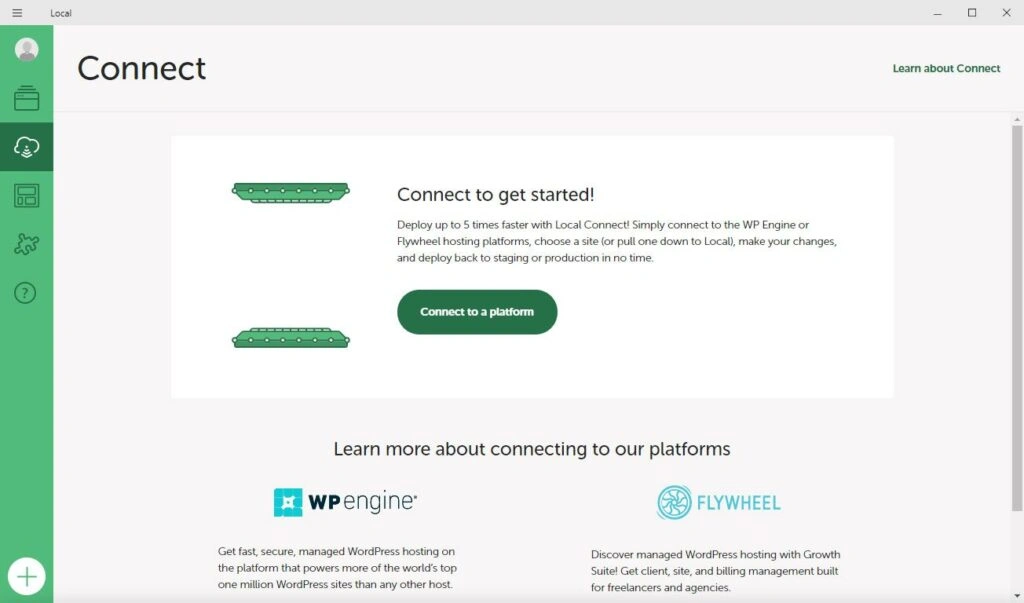 对于第一个选项,你可以使用连接功能,但它只有在你是 WP Engine 或 Flywheel 客户时才有效。如果适用,请点击用户界面左侧的 "连接",然后登录你的 WP Engine 或 Flywheel 账户。