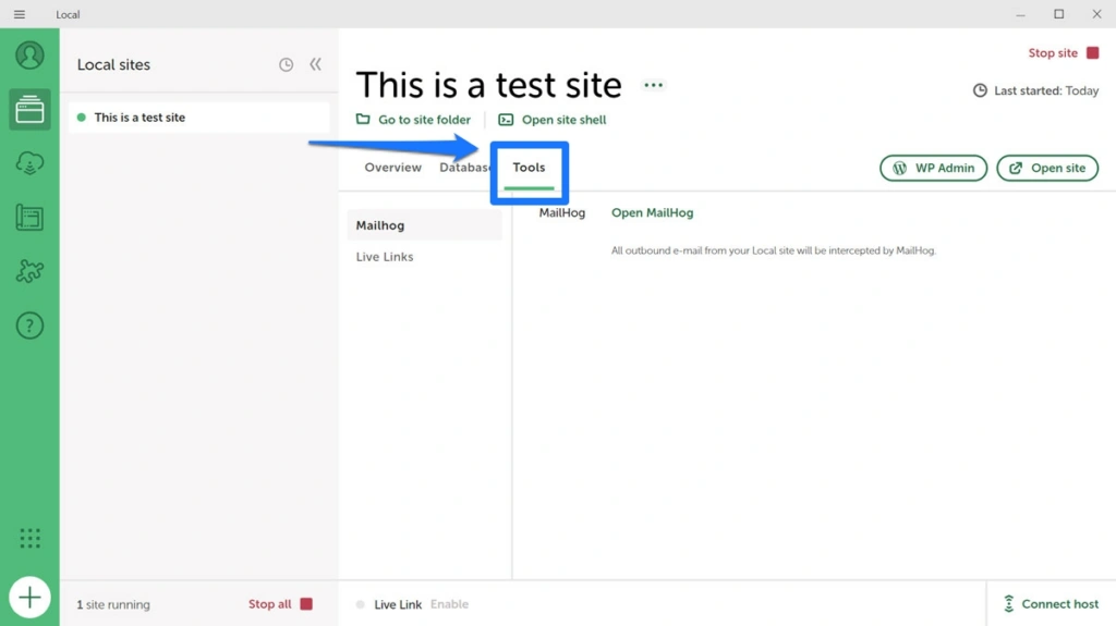 最后,"工具 "可让您访问 MailHog(测试从本地网站发送电子邮件)和 Live Links(我们将在下文进一步讨论该选项)。