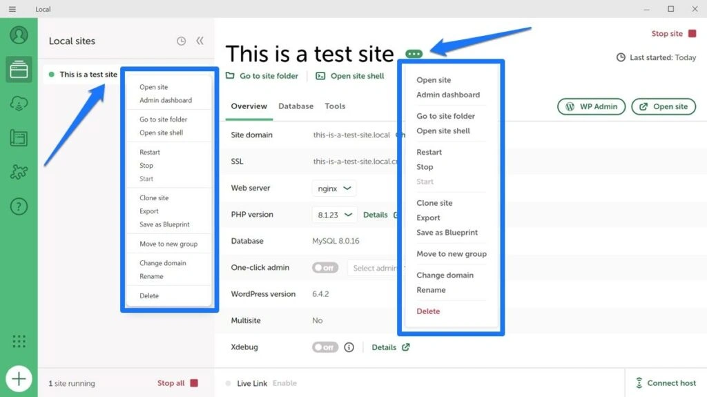 点击左上角的 "房子 "图标,你会看到所有本地网站的列表。你还可以通过图标访问网站的 URL、硬盘上的目录或 WordPress 后台。点击三点图标可停止网站,打开数据库管理器,删除、重命名或克隆网站。