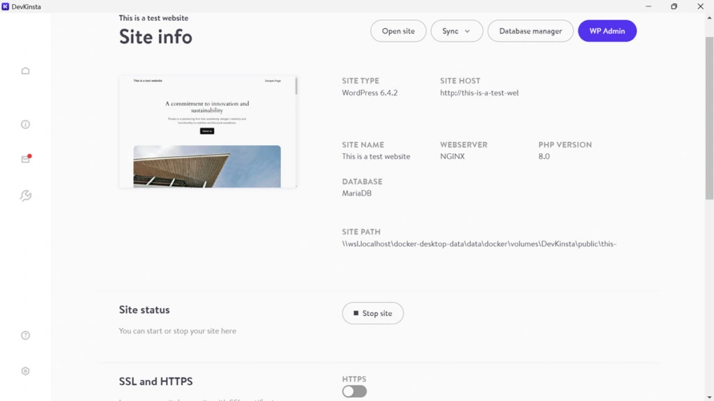 DevKinsta 具有与Local类似的网站管理功能。在顶部,您可以访问每个网站,转到管理器进行数据库管理,或直接跳转到 WordPress 面板(不过没有自动登录功能)。您还可以停止本地服务器运行,并打开 SSL/HTTPS。