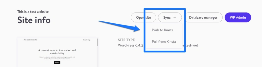 与本地版一样,DevKinsta 也可以将网站推送到暂存和生产服务器,或从暂存和生产服务器拉取网站。在这里,该功能被称为同步,您可以在任何开发网站的屏幕顶部找到它。