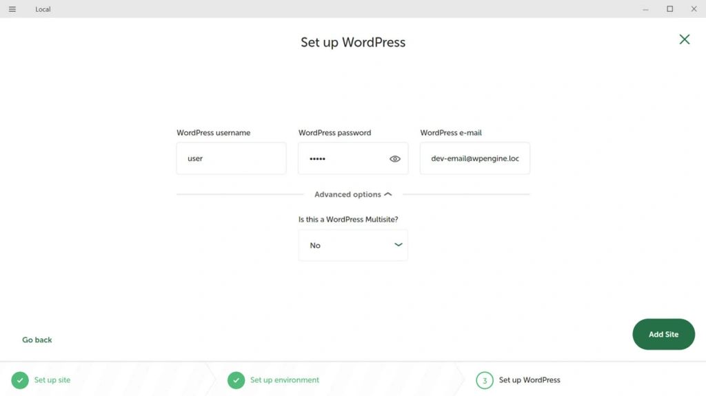 如果您希望将新网站设为多站点,请使用高级选项。完成后单击 "添加网站",Local 将完成包括安装 WordPress 在内的整个过程。完成后,您就可以像使用普通 WordPress 网站一样在浏览器中访问和使用它了。