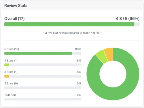 评论统计图表估计需要多少 5 星评级才能达到下一个级别。另一个图表跟踪了 15 天内已解决的支持线程与记录的线程总数的对比。