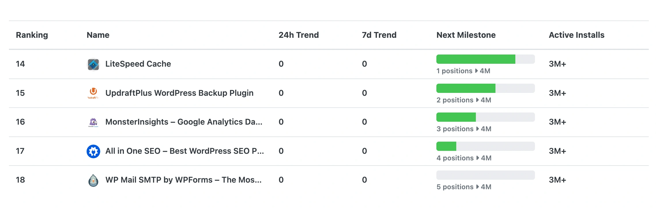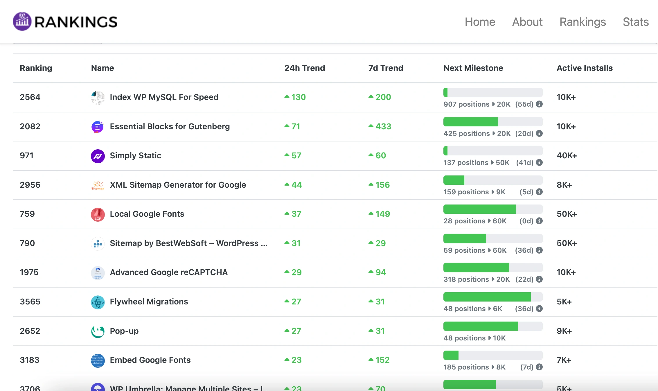 AyeCode 的WP Rankings网站在活跃安装增长图表数据被拉出一周后推出。它显示插件的排名是否高于或低于前一天,以及它需要攀升多少位置才能达到下一个里程碑。主页显示当天的“排名前 50 名的登山者”,这些可以按活跃安装数进行过滤。所有数据每天刷新一次。