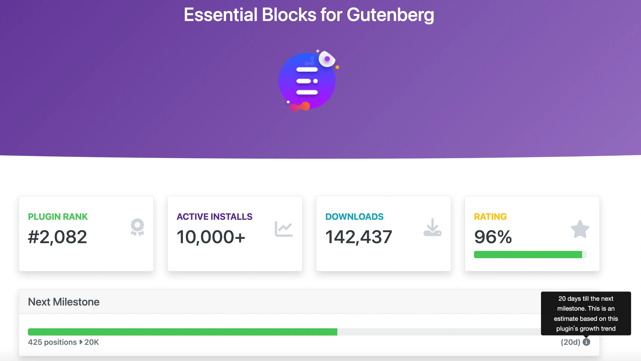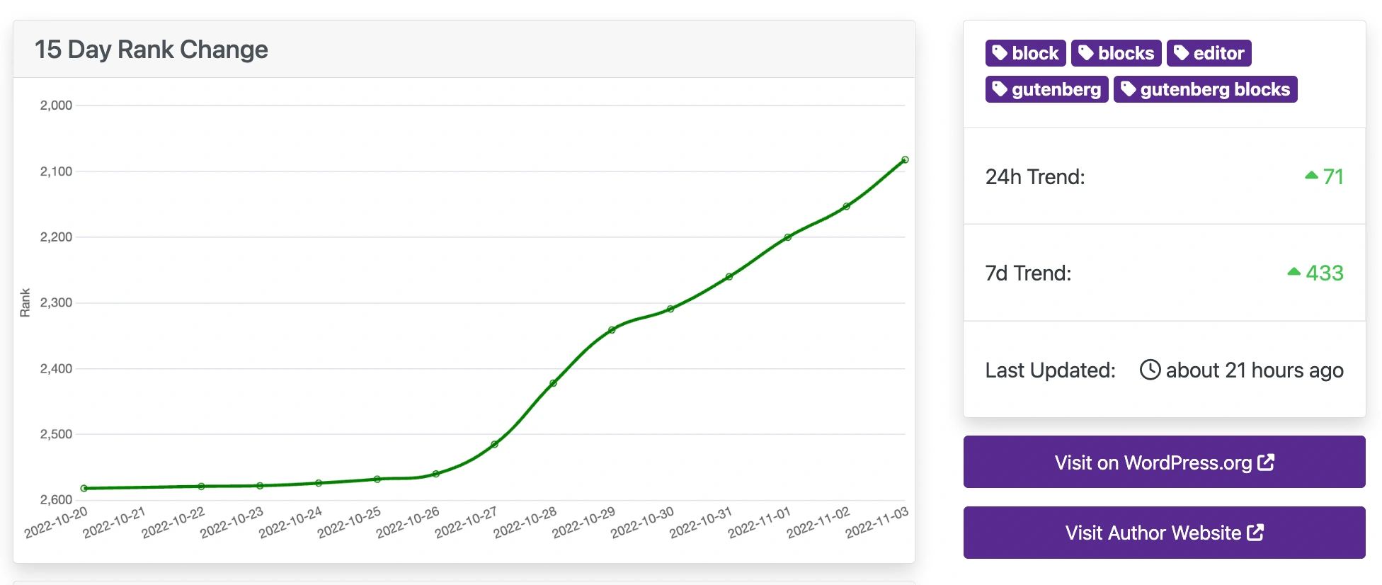 单击各个插件页面可提供更多关于它们在流行插件列表中的变化的图表/图表。来自 API 的数据以各种方式重新混合以推断见解。例如,到下一个里程碑的天数是基于插件当前的增长趋势。